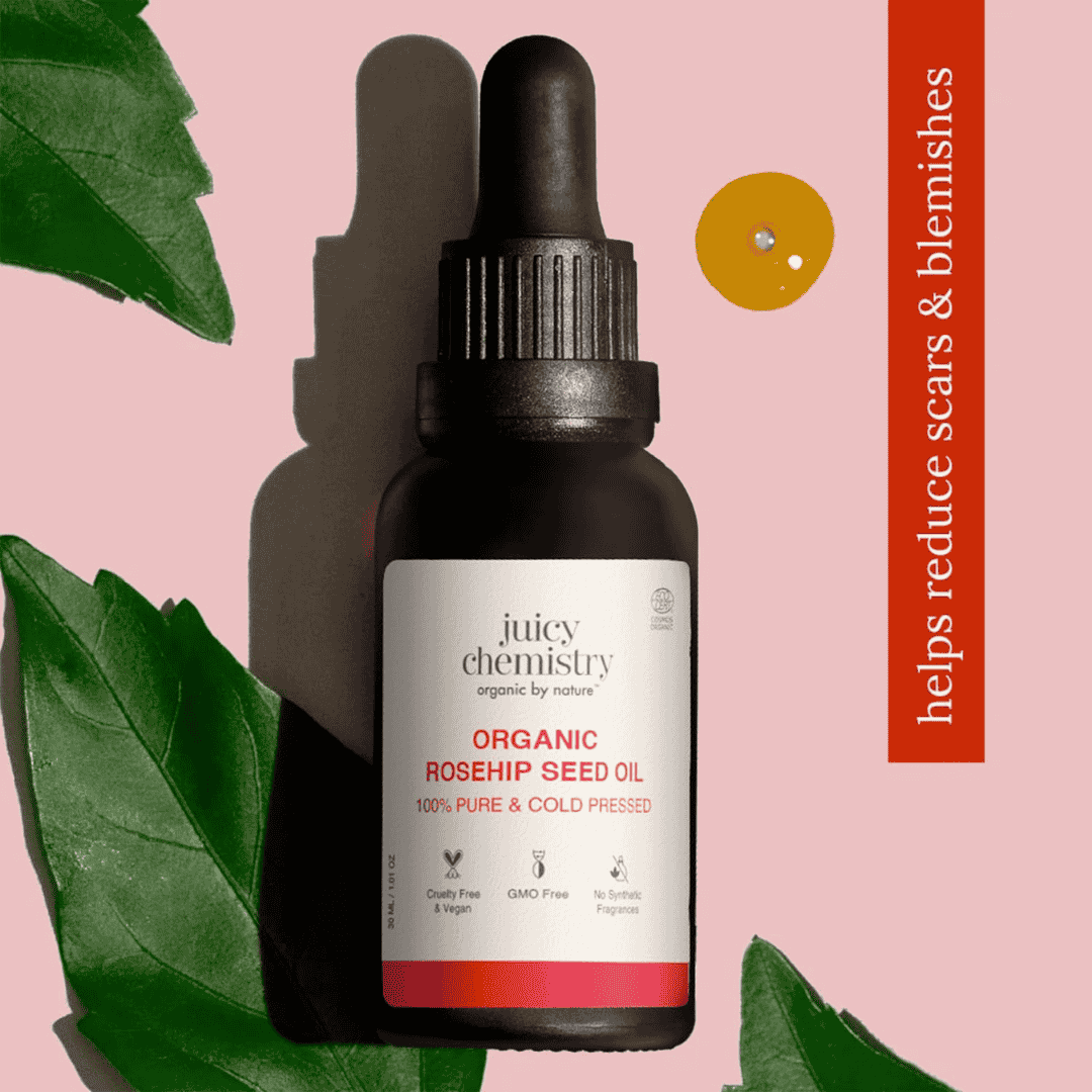 100% pure and organic cold-pressed Rosehip Oil for acne and scars is extracted from the seeds of rose bushes. It is rich in fatty acids, provitamin A and vitamin C.