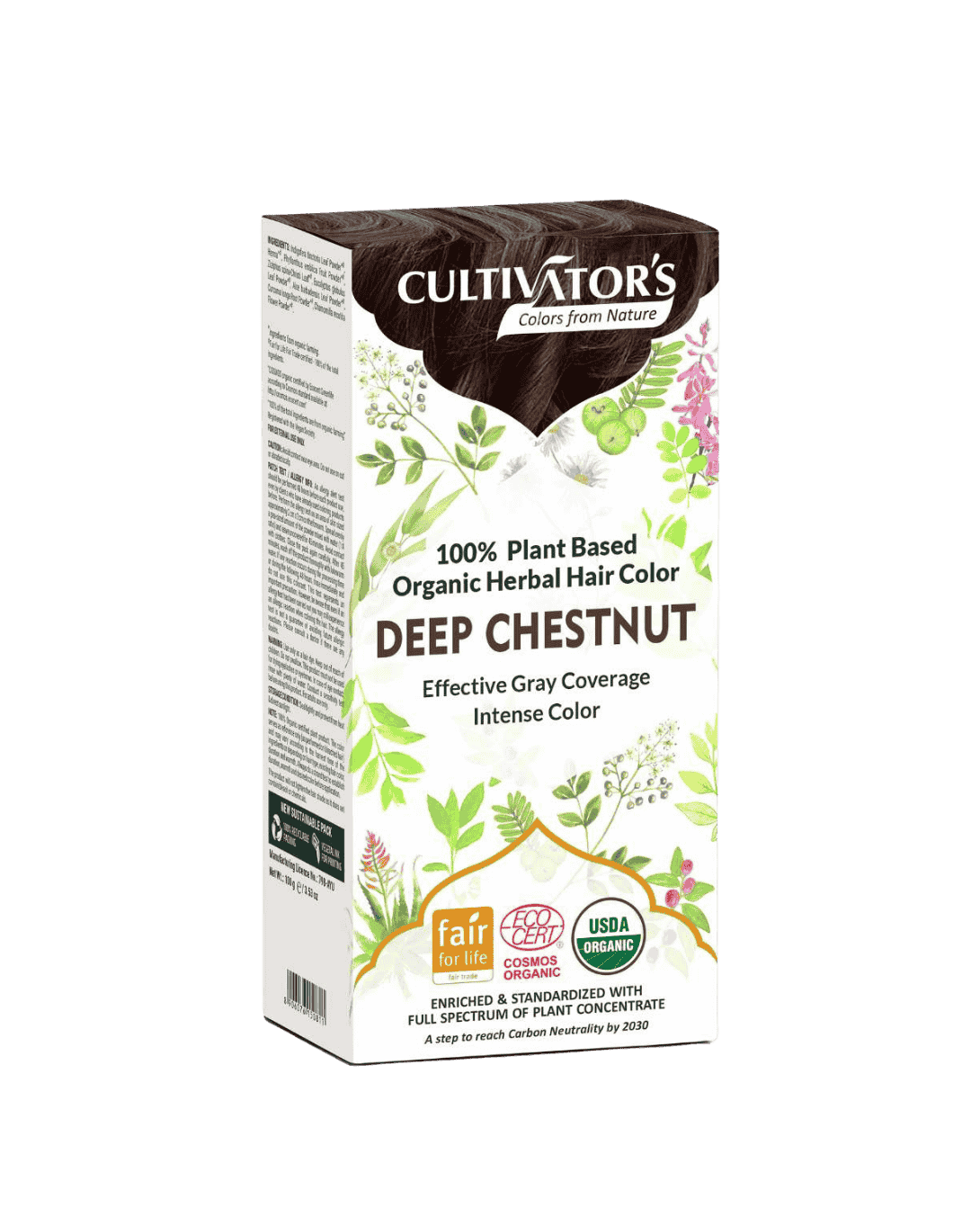 Cultivator's Organic Hair Colours are 100% natural, plant-based herbal formulations completely free from chemicals, peroxide, ammonia, PPD (para-phenylenediamine), and parabens. Unlike chemical dyes that penetrate and damage the hair shaft, these organic colours adhere to hair cuticles, providing a semi-permanent coating that adds colour whilst nourishing hair. They're enriched and standardised with the full spectrum of plant concentrates including Henna, Indigo, Amla, Eucalyptus, Aloe vera, Turmeric, and Chamomile. Chemical dyes can cause severe allergic reactions, hair damage, and scalp irritation, whilst these organic colours are safe alternatives that actually improve hair health. They're USDA certified, COSMOS certified, non-GMO, and Fair for Life certified.